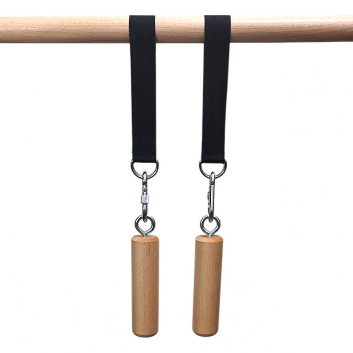 Тренажер для підтягувань виготовлений із міцного бука. Дерев’яні елементи забезпечують надійний і комфортний хват без ковзання. Конструкція легко кріпиться до турніка або перекладини за допомогою строп і карабінів та підходить для регулярних тренувань вдома і в залі.