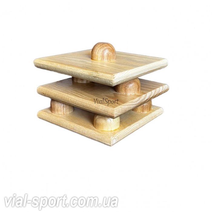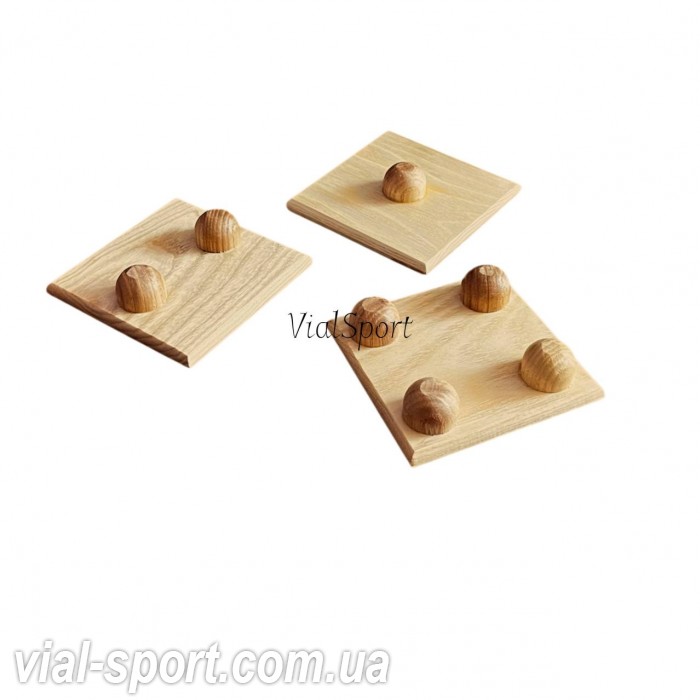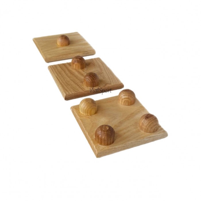 "Качай нога" – це легкий, портативний тренажер з натурального дерева для тренування стоп і гомілки. Його компактні розміри (10x10 см) дозволяють використовувати інструмент вдома або в спортивному залі. Тренажер має декілька варіацій складності завдяки платформам з різною кількістю напівсфер для нахилів у різні боки.